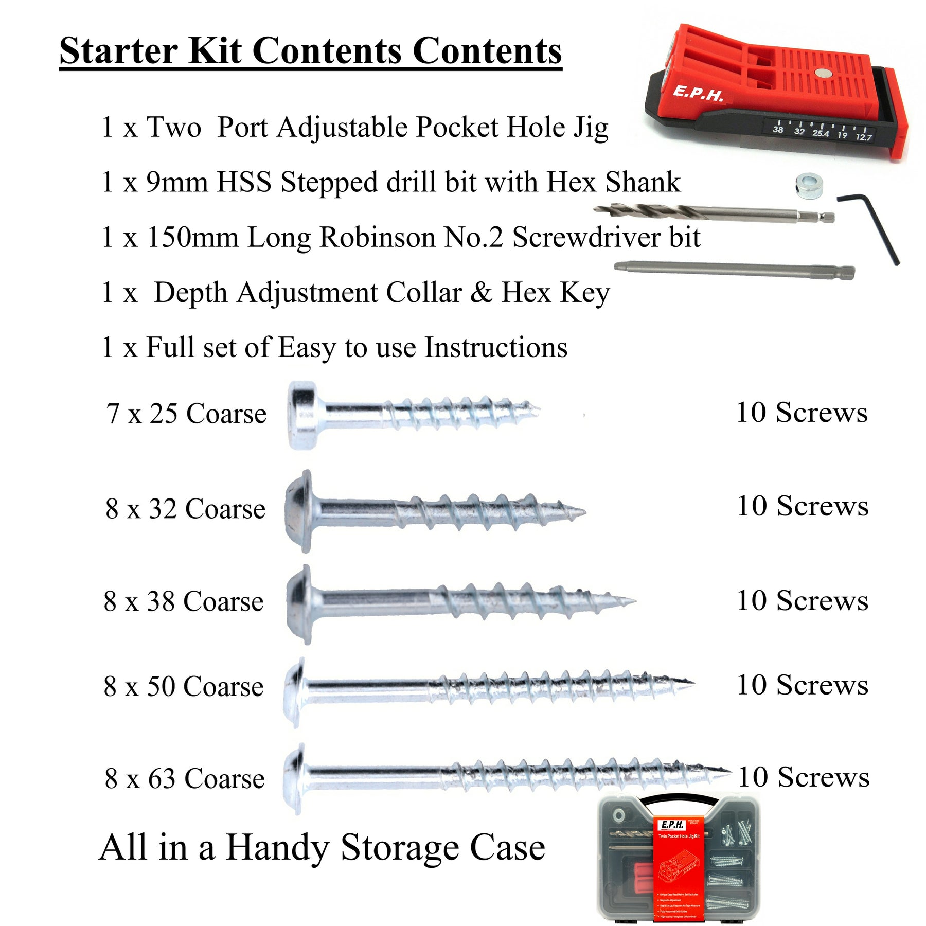 Ensemble de gabarits de trous de poche fantastique comprenant le gabarit de trous de poche double ETPHJBP , un foret de trou de poche et un embout de tournevis Robertson n° 2 de 150 mm pour vis de trou de poche et une variété de vis.