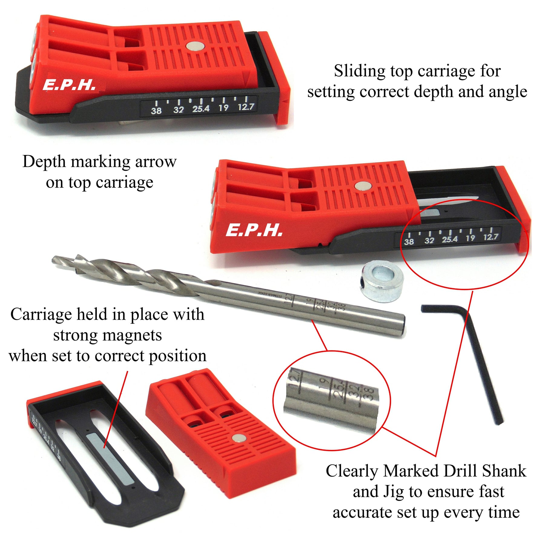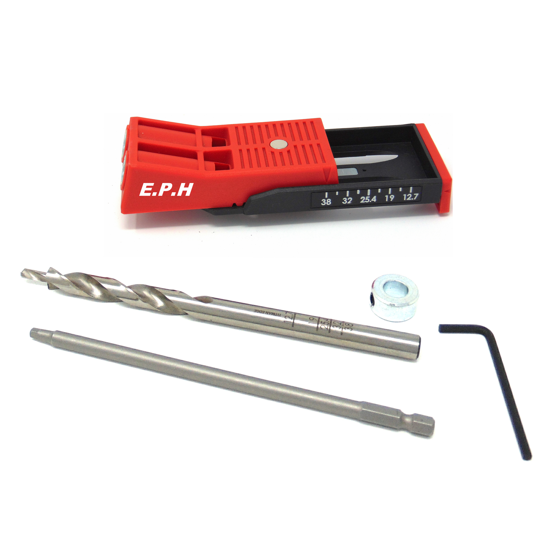 Kit de gabarit de perçage de poche à deux trous avec un foret de perçage de poche étagé, un collier et une clé Allen et un embout de tournevis Robertson n° 2 de 150 mm pour vis de perçage de poche.