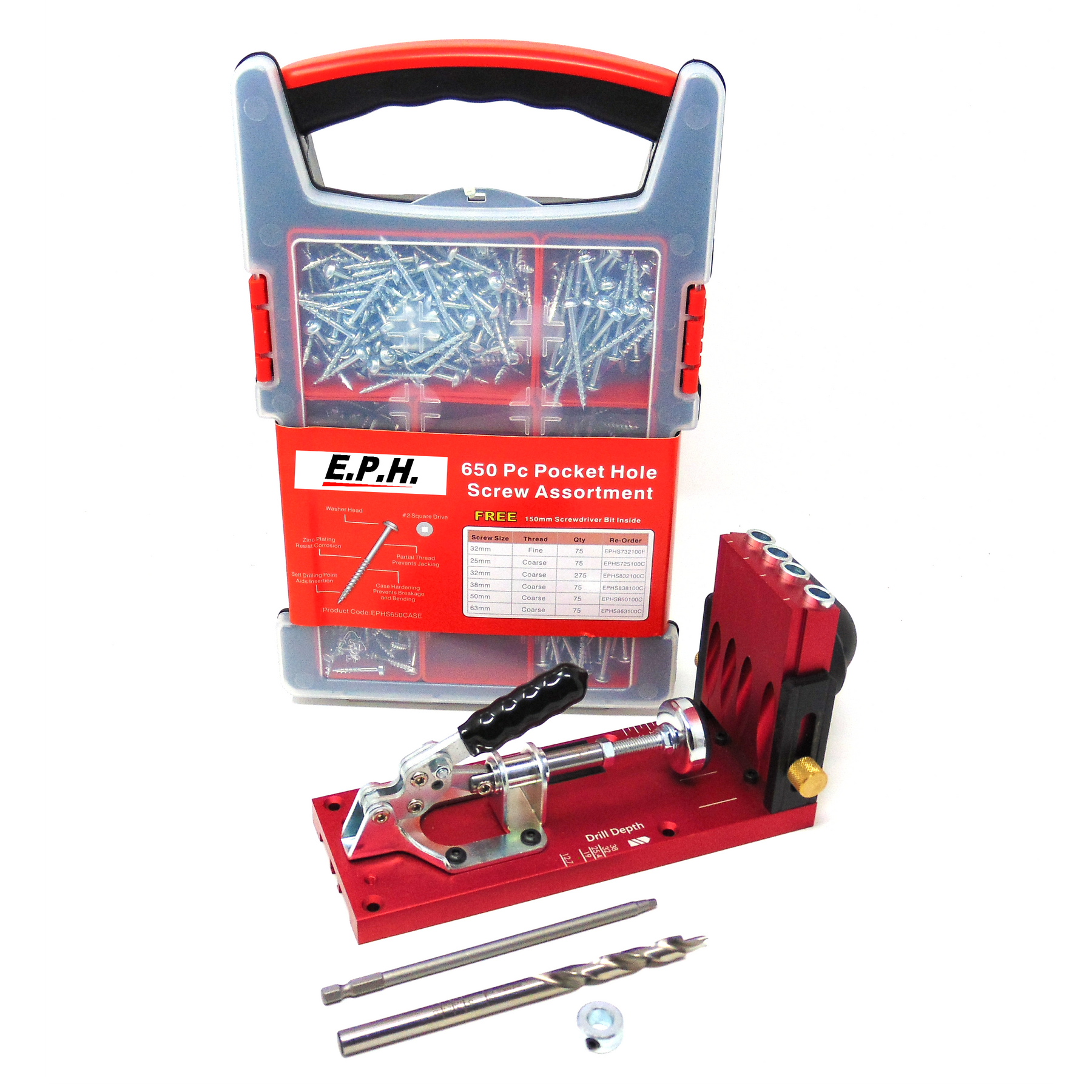 The perfect pocket hole jig for joining timber 12.7mm to 38mm thick, it is fully adjustable with 7 different pre-set width configurations. The jig has a dust extraction port and a unique drill bit with sizes marked on it to match up with the markings on the jig for a fast, efficient, and accurate setup.